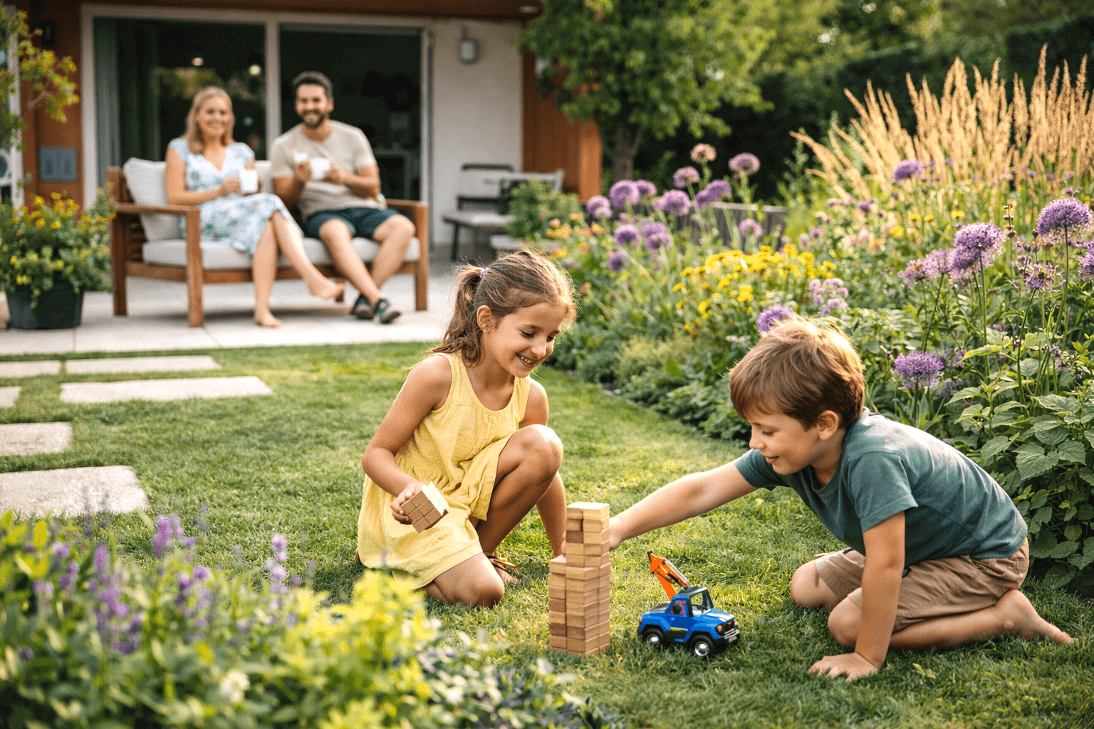Úlohou návrhu bolo vytvoriť jasnú koncepciu celej záhrady a definovať jej hlavné členenie tak, aby bol priestor nielen pekný ale aj funkčný a príjemný na každodenné používanie. V návrhu sa riešilo najmä usporiadanie jednotlivých zón – umiestnenie záhonov, vedenie chodníkov a prepojenie oddychových častí záhrady. Dôležitou súčasťou bolo aj umiestnenie terasy, záhradného domčeka, trampolíny, vodného prvku a ohniska. Výsledkom je harmonická záhrada, kde má každý prvok svoje miesto a ktorá ponúka priestor na oddych, stretnutia aj objavovanie.
