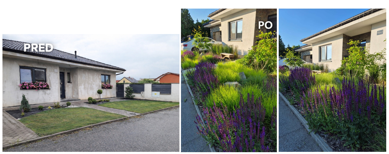 Táto predzáhradka pôvodne pôsobila prázdne a nevyužito a vyžadovala častú údržbu a kosenie trávnika. Požiadavka bola moderná predzáhradka, ktorá vyzerá atraktívne počas celej sezóny, nevyžaduje časté kosenie ani náročnú údržbu, vytvára príjemný prvý dojem pri príchode k domu. Riešením bol návrh modernej predzáhradky bez trávnika, založenej najmä na trvalkách a suchomilných rastlinách, ktoré dobre zvládajú dnešné klimatické podmienky.